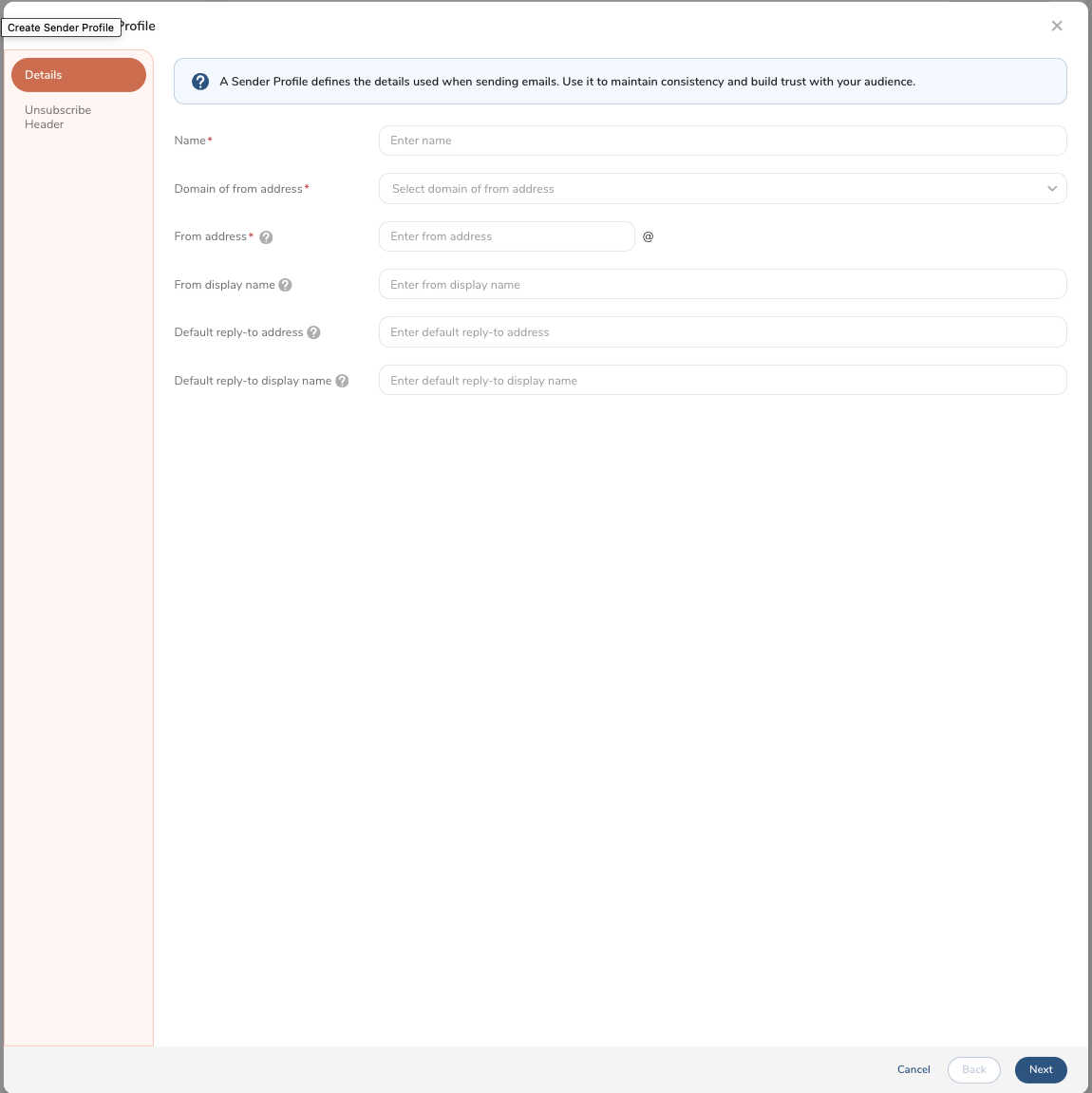 This document explains how to create and manage sender profiles in Engage Studio. Sender profiles define the sender identity and unsubscribe settings used in your marketing emails. Configuring this correctly ensures brand consistency, compliance with email standards, and improved deliverability.