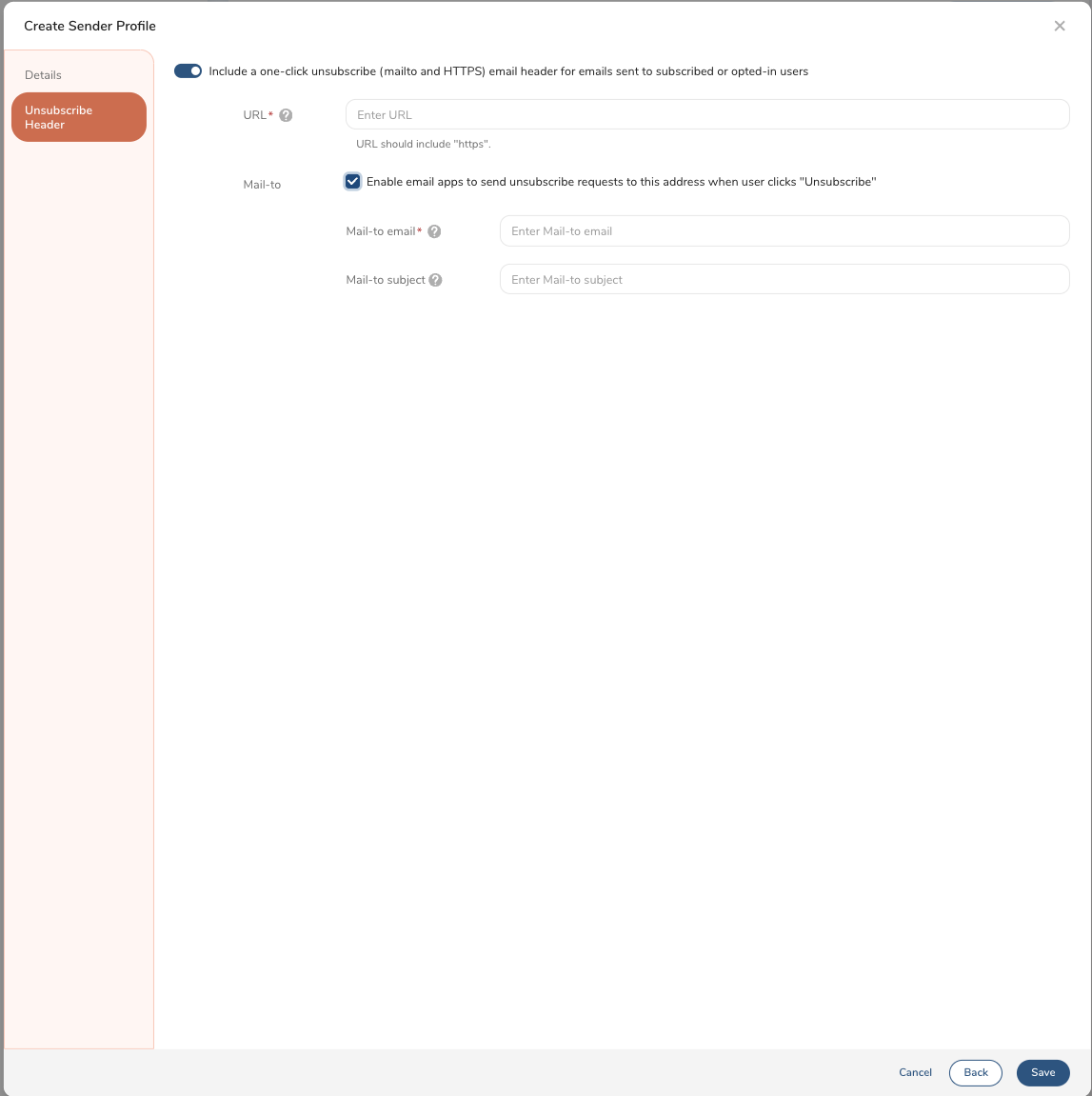 You can enable or disable one-click unsubscribe functionality via toggle. When enabled, it adds List-Unsubscribe headers to your email.