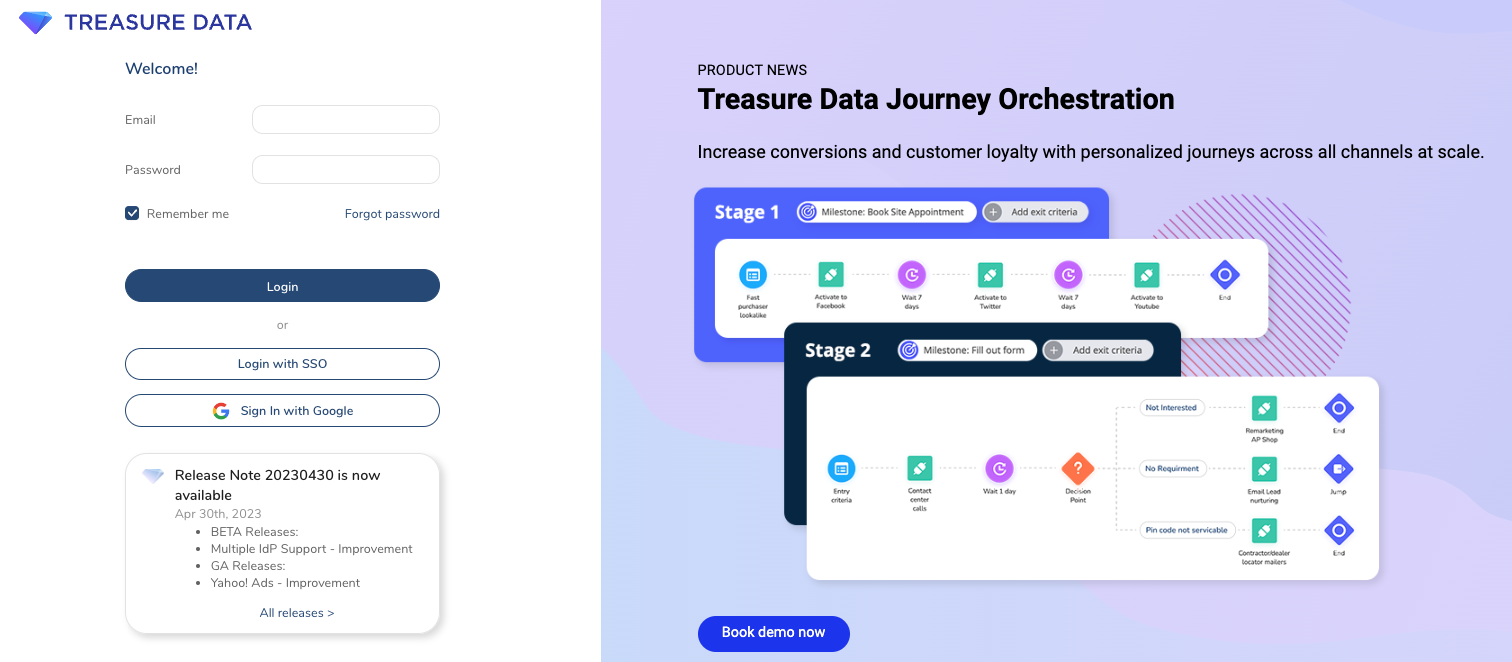 Treasure Data’s new login experience better highlights our latest feature developments and makes it easy to schedule demo.