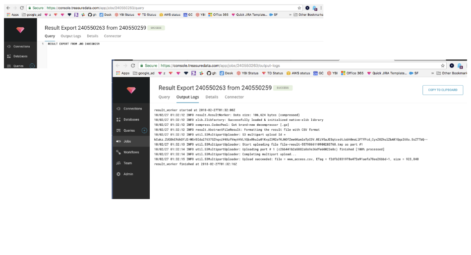 In the Presto/Hive Query Job, the end of the log will now indicate the new Result Export job being created:
