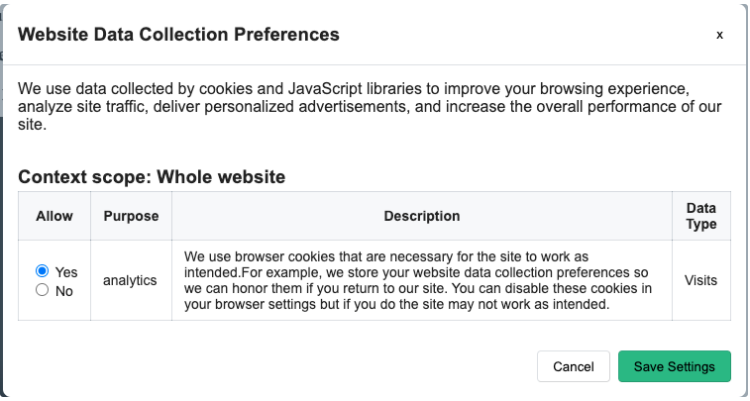 With TD JS SDK Consent Extension, you can include consent collection, define consent context, and show consent preference for end-users.