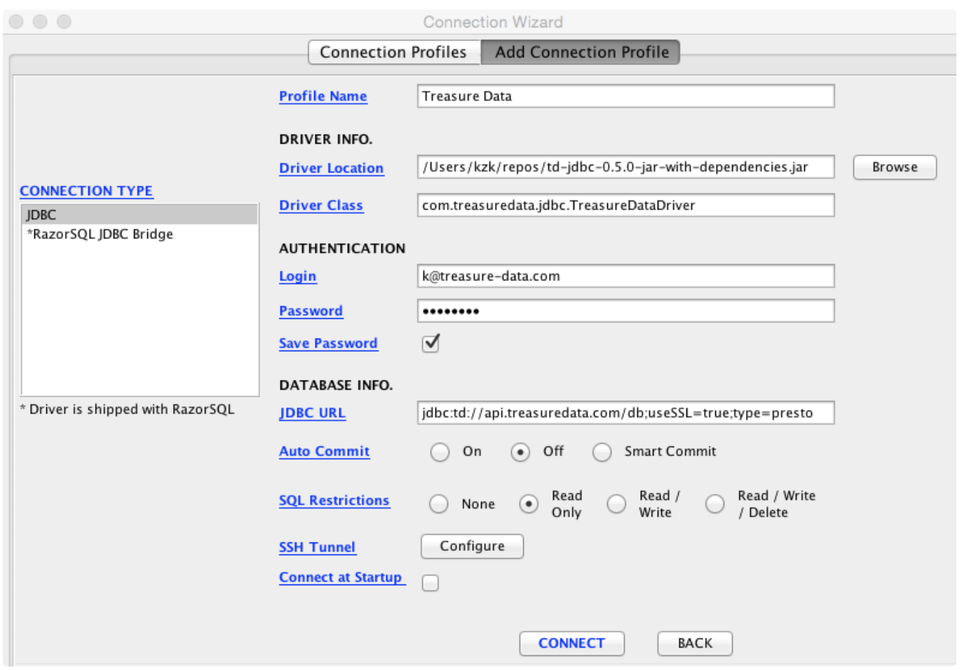Driver Class: com.treasuredata.jdbc.TreasureDataDriver