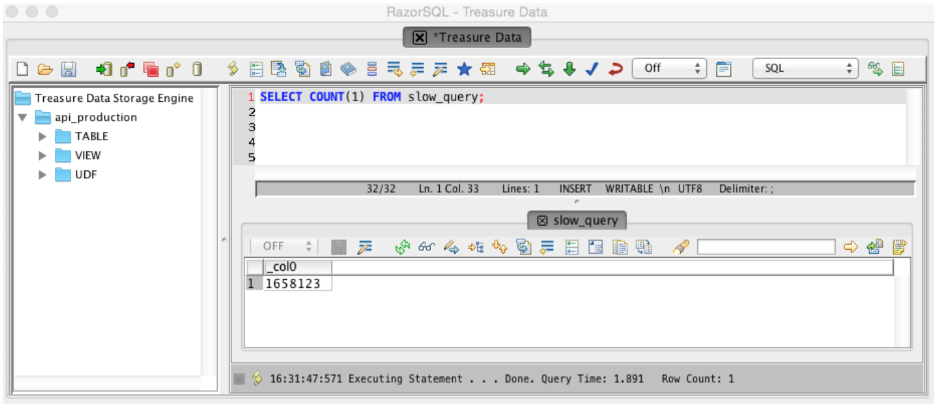 RazorSQL is a free, DBMS-independent, cross-platform SQL query tool. You can use RazorSQL as SQL authoring tool to interactively develop SQL queries with Treasure Data.