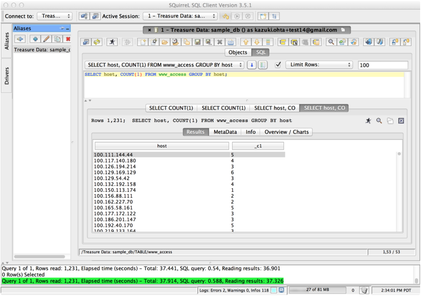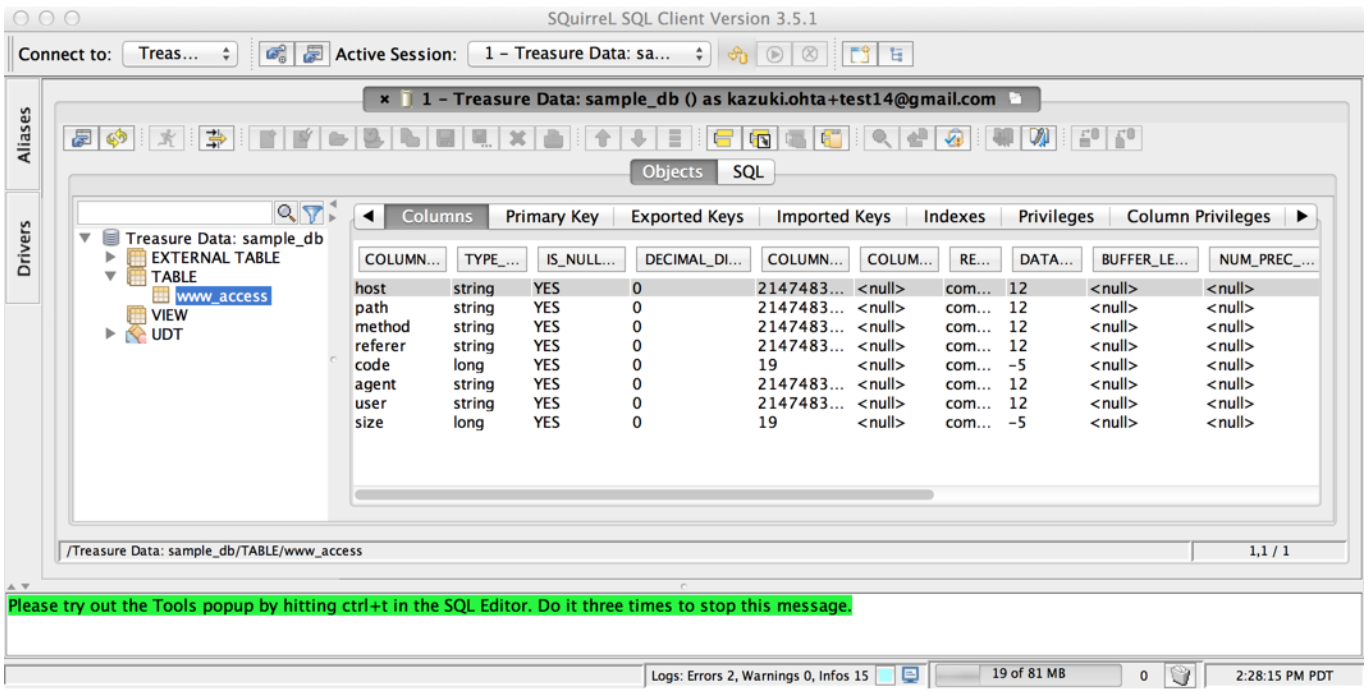 SQuirreL SQL is an open-source Java SQL Client program for any JDBC compliant database. You can use SQuirrelSQL as a SQL authoring tool to interactively develop SQL queries with Treasure Data.