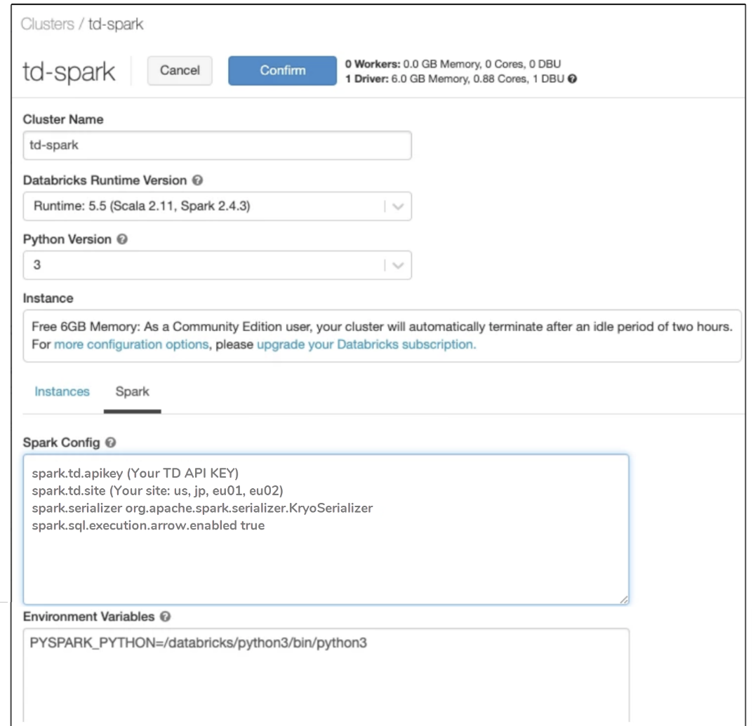 In the Spark configuration, you specify the Treasure Data API key and enter the environment variables.